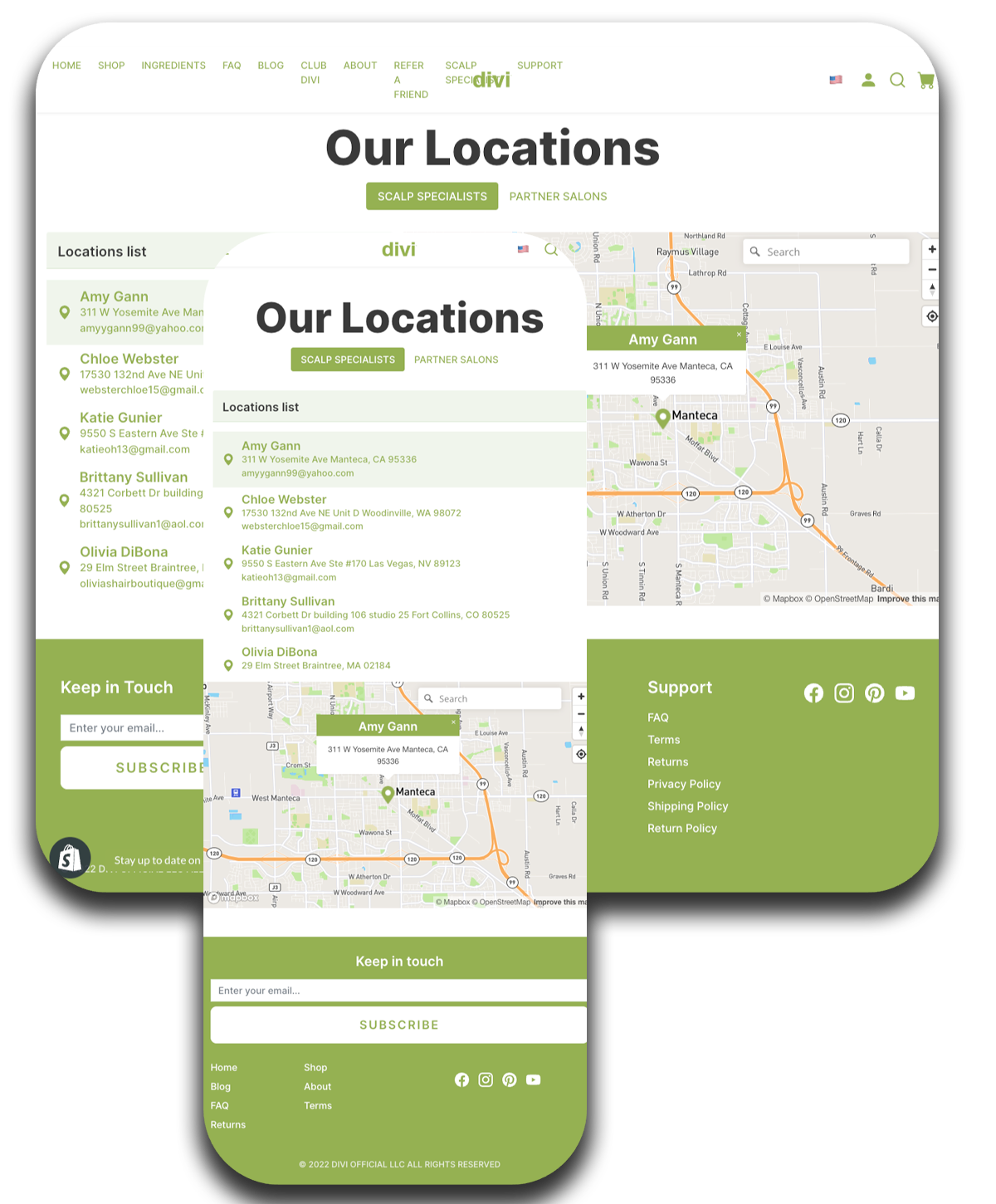 DIVI Beauty LLC asked us to build from sratch a store locator, which is something that they had never done in the past. Because to its exponential growth, DIVI Beauty LLC required particular needs in order to function properly. There is a category for scalp specialists, and another tab is dedicated to the program that they work with.