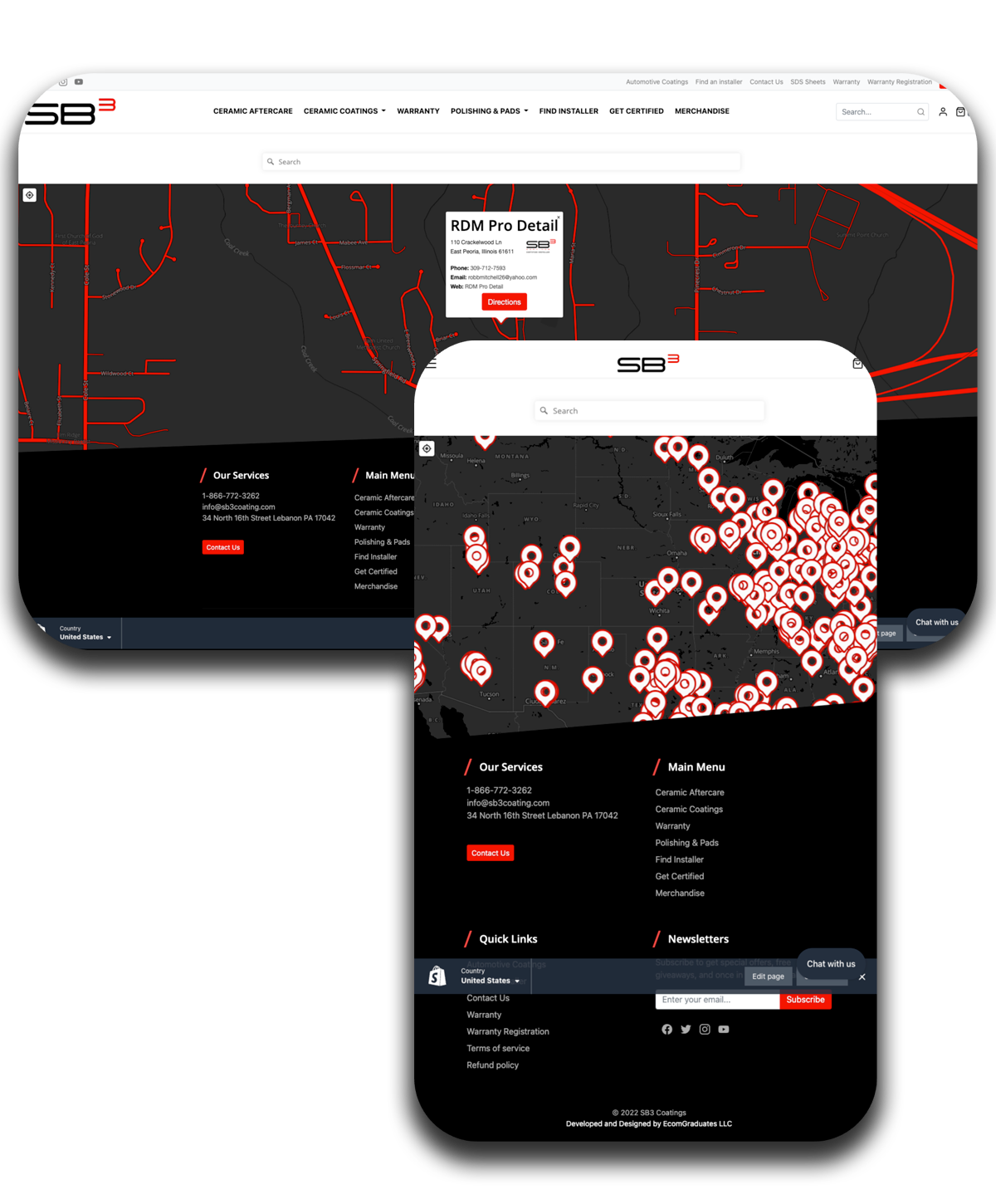 SB3 Coatings approached us with a shop locator that had been developed by an earlier firm, but regrettably, it had not been maintained up to date with the company's new logo. In addition to this, the map pointers were not set up correctly, and there were a few other issues that needed to be addressed and resolved.